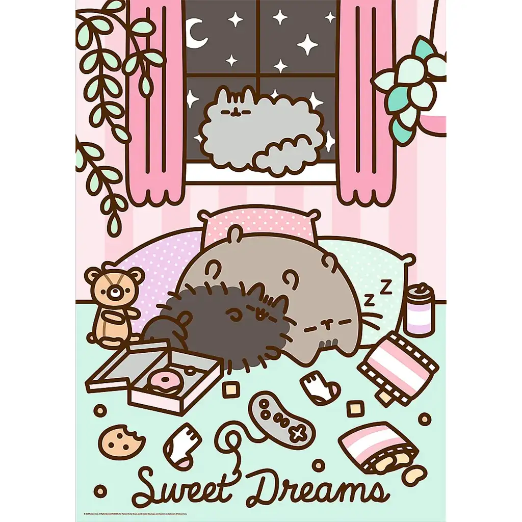Pusheen, jedna z najroztomilejších mačiek na svete, ožíva v tomto rozprávkovo roztomilom 1000-dielnom puzzle, ktoré je dokonalou voľbou pre každého malého (aj veľkého) fanúšika. Puzzle „Pusheen – Sladké sny“ zobrazuje pokojnú, útulnú večernú chvíľu: Pusheen a jej priatelia driemu medzi mäkkými vankúšmi, okolo nich sú krabica od pizze, sušienky, herný ovládač a všetko, čo je potrebné na perfektnú pyžamovú párty. Pastelové farby, minimalistický štýl a detailná ilustrácia zaručene očaria každého.