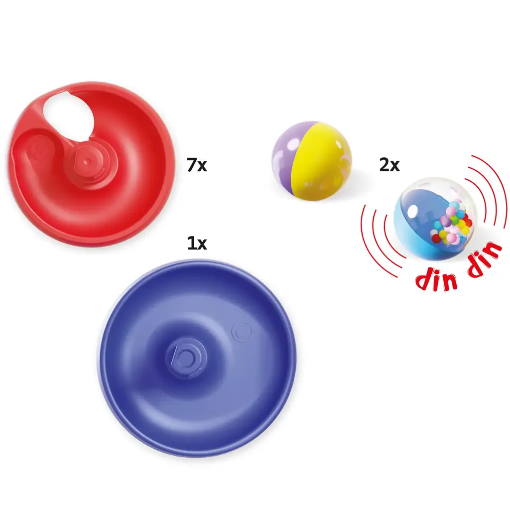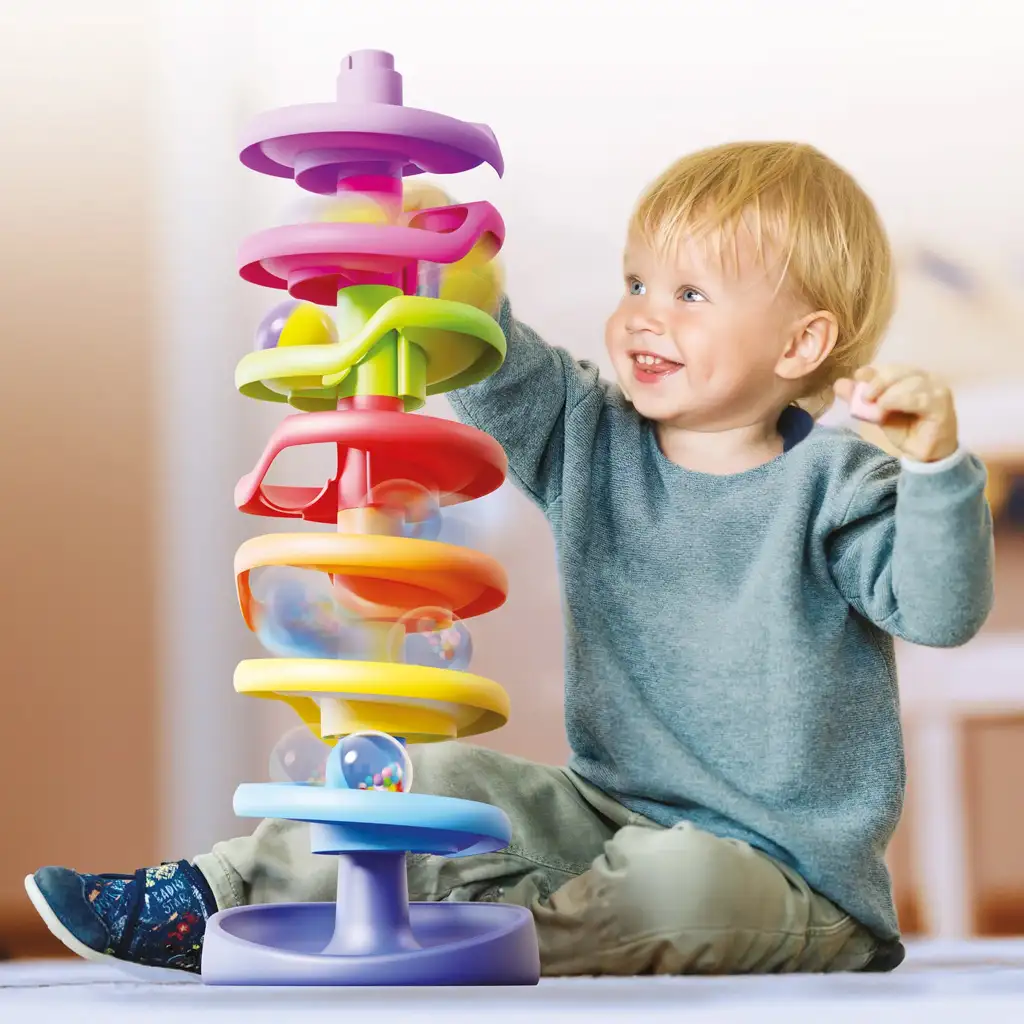 Súprava obsahuje 7 špirálových dráh, stabilný podstavec a 2 guľôčky – z ktorých jedna je farebná hrkajúca guľa, ktorá počas pohybu vydáva zvuk a ešte viac umocňuje zážitok. Druhá guľôčka svojimi farebnými, kontrastnými vzormi priťahuje pozornosť dieťaťa a podnecuje jeho pozorovacie schopnosti. Veža sa dá jednoducho zložiť, dieliky do seba stabilne zapadajú a pri hre sa nielen rozvíja jemná motorika, ale deti začínajú chápať aj príčinné súvislosti.