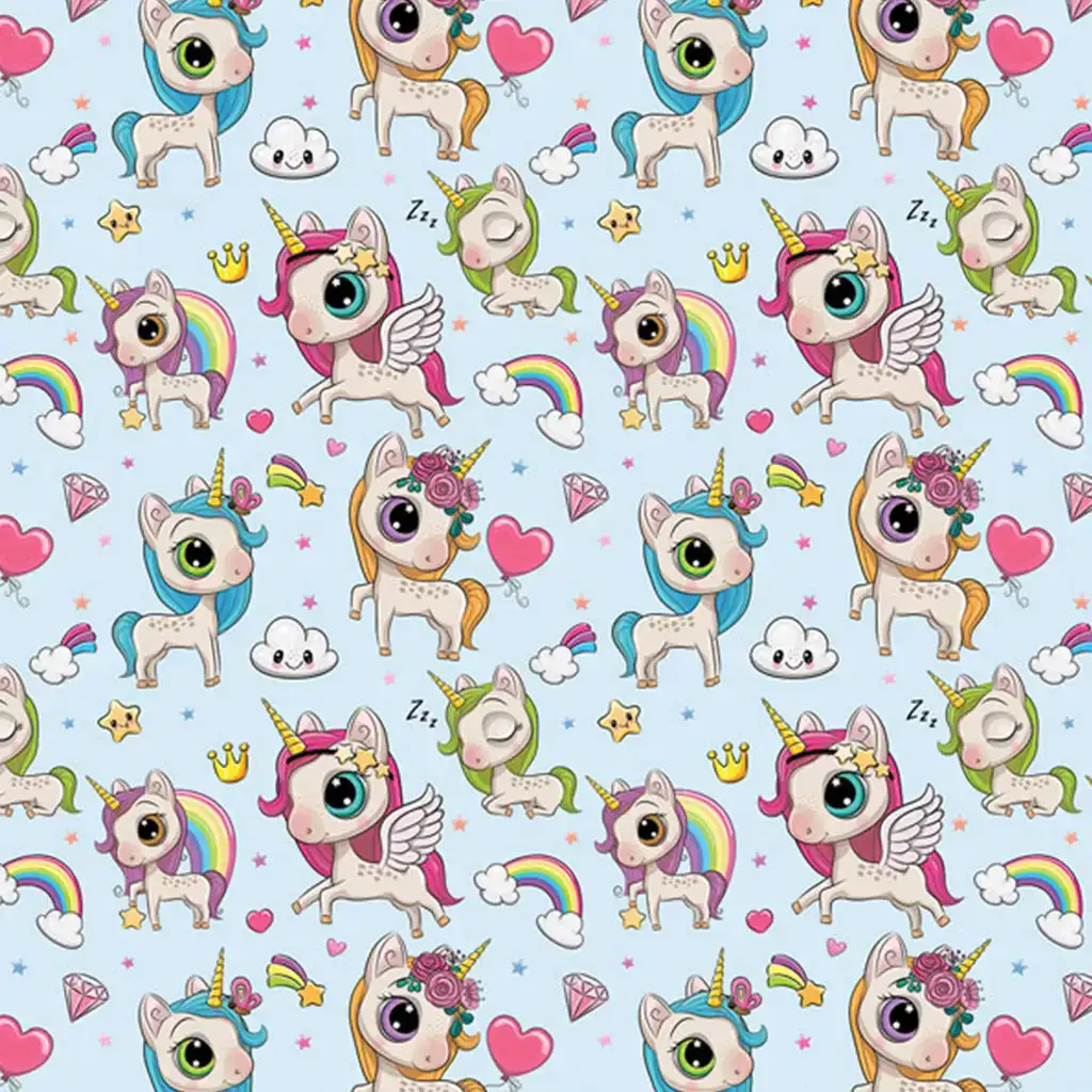 Vzory sú naozaj veselé a hravé: malé roztomilé jednorožce sú zobrazené v rôznych pózach – niektoré spia, iné sa trblietajú dúhovou hrivou a rohom. Svetlomodré pozadie zvýrazňuje pastelové prvky, takže balenie pôsobí zároveň nápadne aj harmonicky. Oblaky, korunky, diamanty a banány robia celkový dojem ešte rozprávkovejším.