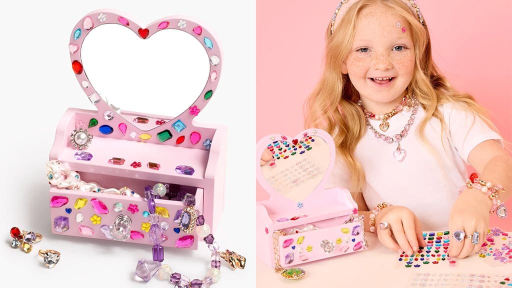 Zažiar naozaj počas svojich GRWM (Get Ready With Me) momentov s týmto mini toaletným stolíkom! Tento výnimočný kúsok je dokonalou voľbou, ak rada líčiš, upravuješ si vlasy alebo si chceš dopriať chvíľku pre seba. Vďaka kompaktným rozmerom sa ľahko zmestí do tvojej izby, no zároveň naň môžeš uložiť všetky potrebné doplnky. Či už ide o rýchlu rannú prípravu alebo popoludnie s kamarátkami, tento mini toaletný stolík ponúka štýlové a praktické riešenie na každú príležitosť. Objav svet lesku a kreativity a dopraj si skutočný zážitok hviezdy vo svojom domove!Dodaj trochu **lesku** a **čarov** do svojich každodenných dní s **Mini Vanity Gemify kreatívnou súpravou**! Tento **ružový toaletný stolík** so **zrkadlom v tvare srdca** si deti môžu ozdobiť **farebnými kamienkami** a **trblietavými strass nálepkami**, aby bol naozaj jedinečný. Súprava obsahuje **policu** a **praktickú zásuvku**, ktoré sú ideálnym miestom na detské **náhrdelníky**, **náramky**, **sponky do vlasov** a aj na **kefu na vlasy Style and Shine Gemify ozdobenú drahokamami**. Táto súprava nielen rozvíja kreativitu, ale pomáha aj pri **organizovaní** a **dekorovaní izby**, takže sa každé dievčatko môže cítiť ako skutočná princezná!