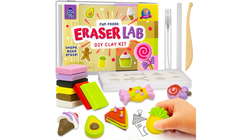 Tento kreatívny set od Purple Ladybug obsahuje všetko, čo deti potrebujú na vytvorenie vlastných, jedinečných gumiek. Pomocou silikónovej formy môžu deti vytvárať veselé tvary podľa troch tém setu: zábavné jedlá, morské panny a jednorožce, ako aj roztomilé zvieratká.