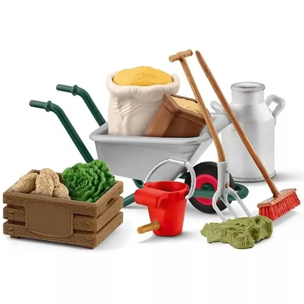 Sada obsahuje odolný fúrik, do ktorého sa dajú umiestniť vrecia s obilím a senom, takže deti môžu predstierať proces kŕmenia zvierat. O čerstvé krmivo pre zvieratá sa stará zeleninová debna, v ktorej sa nachádzajú zemiaky a šalát. Na každodennú starostlivosť o farmu je potrebná metla a vidly, ktoré sú tiež súčasťou sady. S týmito nástrojmi môžu deti predstierať, ako čistia stajňu a zabezpečujú čisté a pohodlné prostredie pre zvieratá.