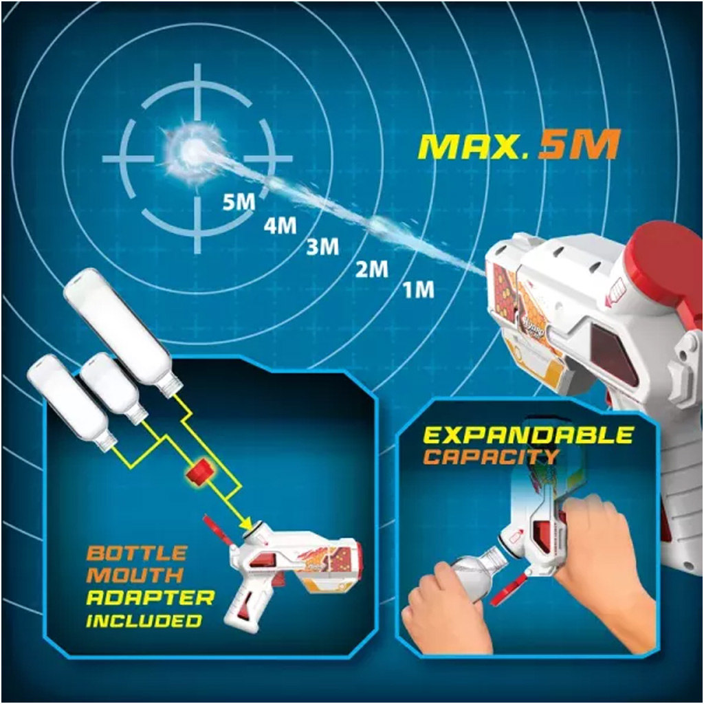 Vstavané svetelné efekty pridávajú hre extra vzrušenie: počas prevádzky svieti, čo používanie robí obzvlášť efektným. V balení sa nachádza adaptér na fľaše, ktorý umožňuje pripojiť fľaše rôznych veľkostí, čím možno podľa potreby zväčšiť kapacitu nádržky – ideálne pre dlhšie hranie.
