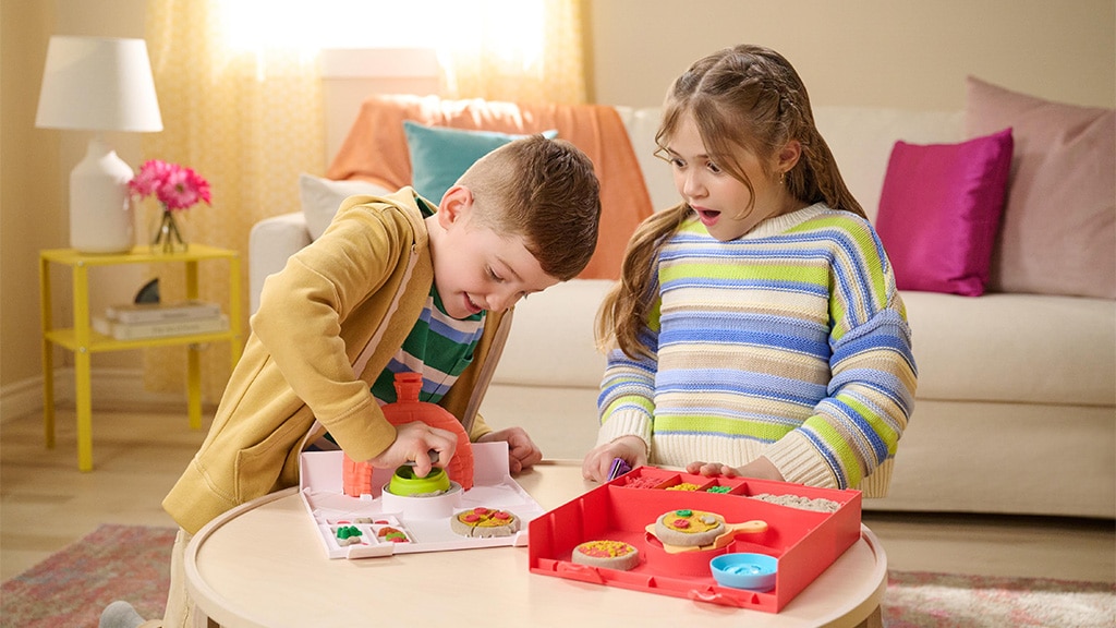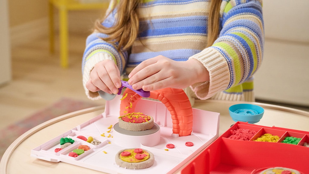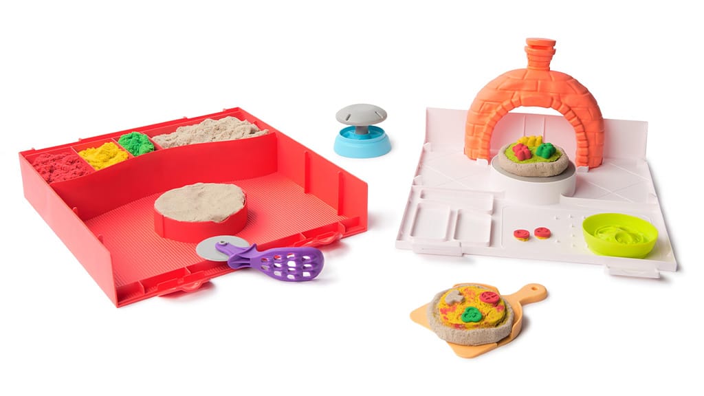 Deti si môžu vytvárať vlastné, jedinečné kombinácie pizze pomocou štyroch farieb kinetického piesku a rôznych foriem na oblohu, potom ich umiestniť do imaginárnej pizzapece, aby videli, ako sa „upečú“ a zdvihnú. Táto kreatívna hra rozvíja zručnosť, fantáziu a tiež rozpoznávanie farieb a tvarov. S produktmi značky Kinetic Sand sa deti môžu zabávať celé hodiny, zatiaľ čo riadia vlastnú pizzériu, skúšajú rôzne oblohy a farebné kombinácie a môžu sa o svoje výtvory podeliť aj s kamarátmi.