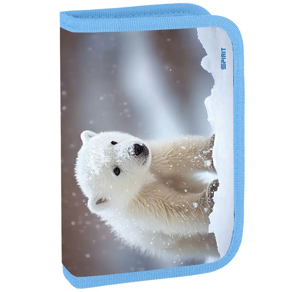Toto Spirit puzdro na perá je naozaj hrejivý kúsok, ktorý zdobí roztomilý malý ľadový medvedík na zasneženom pozadí – určite si získa všetky deti, ktoré milujú zvieratá! Mäkký, biely, huňatý ľadový medvedík a pohľad na padajúci sneh vytvárajú priateľskú, pokojnú atmosféru, takže puzdro na perá je nielen praktickým, ale aj vizuálne upokojujúcim školským doplnkom. Svetlomodrý lem dokonale ladí so zimným motívom, vďaka čomu je ideálnou voľbou pre chlapcov aj dievčatá.