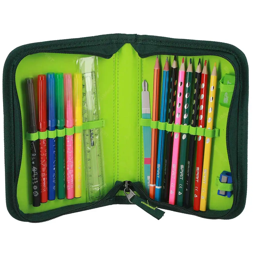 Zipsový peračník je vybavený písacími potrebami, ako je vidieť na obrázku, ale vždy je dobré skontrolovať konkrétny popis produktu pre potvrdenie obsahu. Športová taška je ideálna na tréning alebo telesnú výchovu a peňaženka bezpečne uchováva vreckové dieťaťa.