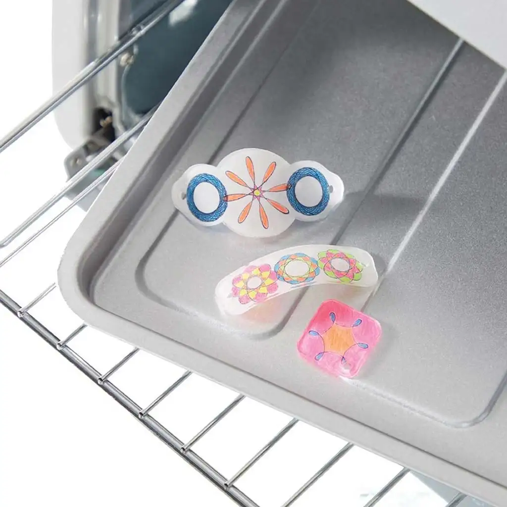 Súprava obsahuje všetko potrebné na výrobu špirálových príveskov. Pomocou známej metódy Spirograph deti najprv nakreslia vzory na špeciálne, teplom zmršťovacie fólie. Na to môžu použiť gumové krúžky, ktoré pevne držia fóliu na mieste, zatiaľ čo pomocou šablón môžu vytvárať úžasné špirály a tvary. Súprava obsahuje 7 neónových farieb, ktoré robia vzory naozaj pôsobivými.