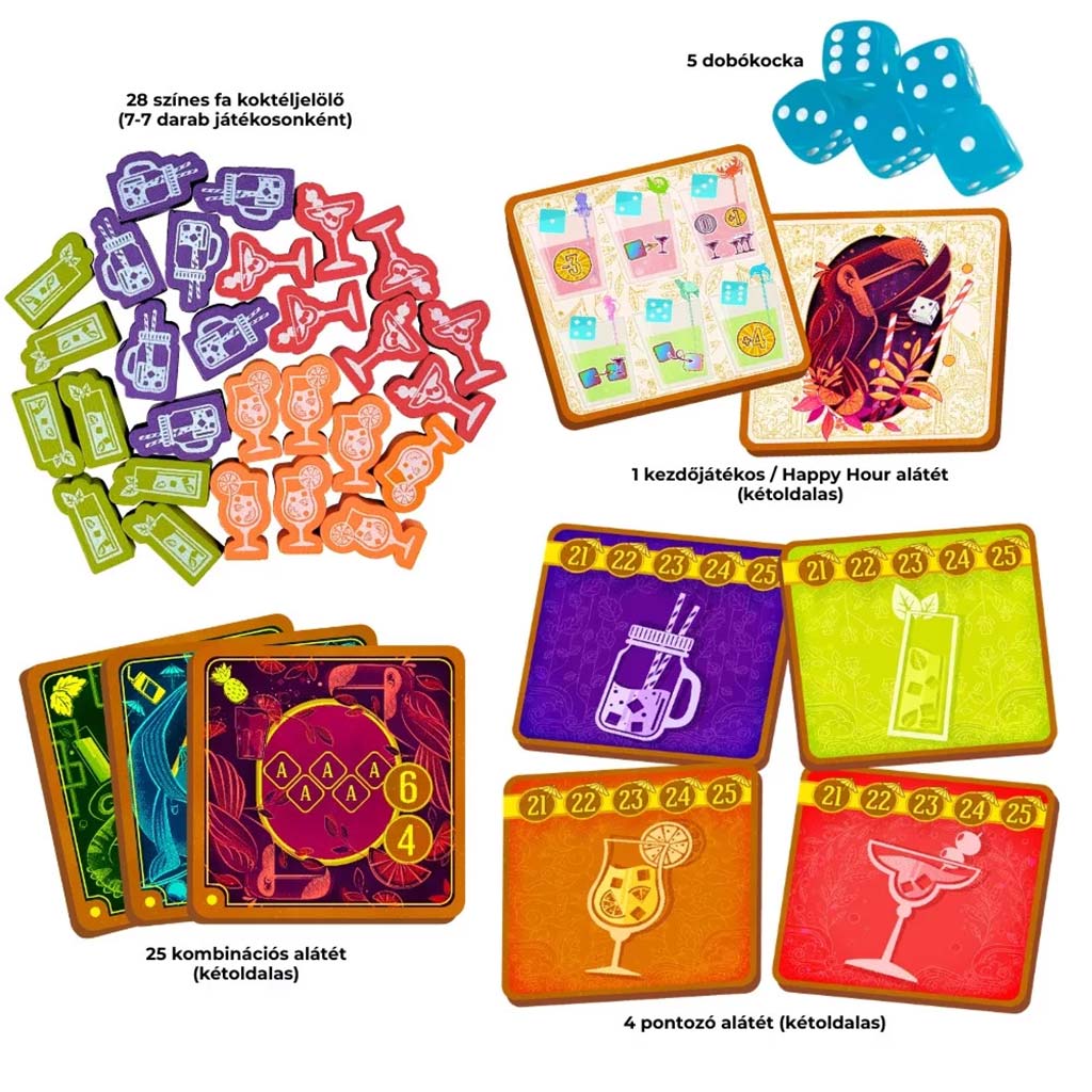 - Obsah krabice: 5 šesťstenných hracích kociek, 28 drevených kokteilových žetónov, 30 podložiek pod poháre, 1 knižka s pravidlami