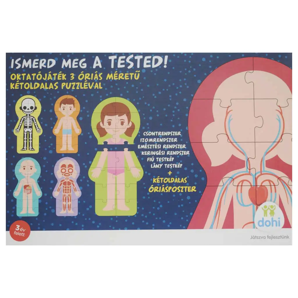 Súprava pozostáva z troch obrovských, obojstranných puzzle, ktoré predstavujú ľudské telo z rôznych pohľadov. Dieťa môže spoznať kostru, svaly, obehovú sústavu, tráviaci systém, ako aj základné rozdiely medzi chlapčenským a dievčenským telom. Na druhej strane sa nachádza obojstranný obrovský plagát, ktorý pomáha pri ďalšom učení a opakovaní a môže byť zavesený aj na stenu detskej izby, takže zostane stále na očiach.