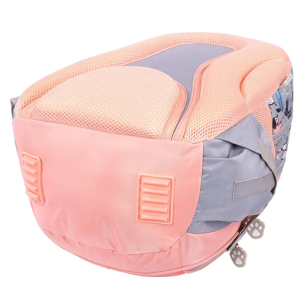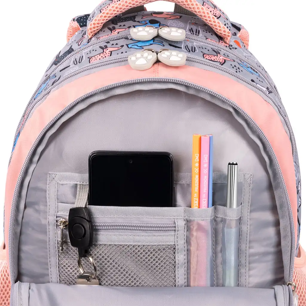 Vonkajšia časť tašky je ozdobená veselými psími vzormi, ktoré určite potešia vaše dieťa. Štyri samostatné priehradky poskytujú dostatok miesta na učebnice, zošity a iné školské potreby, takže všetko zostane usporiadané. Dve bočné elastické vrecká sú ideálne na uloženie fľaše s vodou alebo menších predmetov.