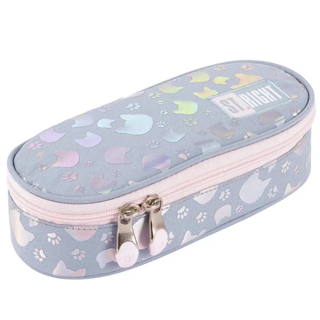 St.Right Silver Cats oválny peračník s mačkami s veľkosťou 23 cm je ideálnou voľbou pre každého malého žiaka, ktorý miluje mačky a štýlové školské doplnky. Tento peračník je zdobený elegantným strieborným vzorom mačiek a malými odtlačkami labiek, čo zaručene oživí každodenné školské aktivity.
