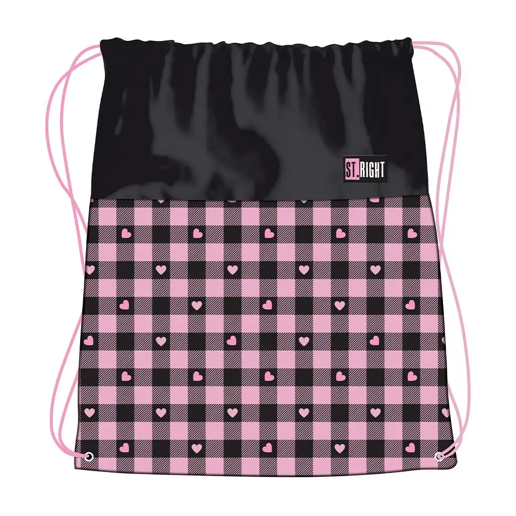 Tento športový vak je perfektnou voľbou pre všetky deti, ktoré obľubujú jedinečné a štýlové doplnky. Čierno-ružový károvaný vzor so zdobením malými srdiečkami dodáva vaku veselý a módny vzhľad, takže vaše dieťa si ho rado vezme na hodinu telesnej výchovy, tréning alebo aj na výlet. Horná čierna časť elegantne kontrastuje s farebnou spodnou časťou a ružové sťahovacie šnúrky harmonizujú s dizajnom.
