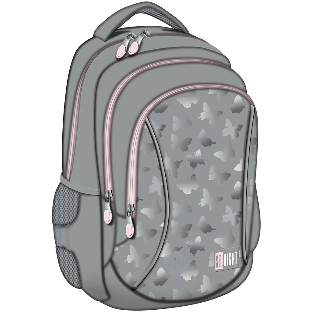 St.Right Silver Butterfly trojkomorový školský batoh BP26 je perfektnou voľbou, ak hľadáte elegantný, ale pritom praktický a pohodlný školský batoh pre vaše dieťa! Štýlová sivá základná farba a jemne trblietavé motívy motýľov dodávajú tomuto batohu skutočne moderný vzhľad. Decentné ružové zipsy zároveň prinášajú jemnú ženskosť, vďaka čomu je tento batoh mimoriadne obľúbený medzi dievčatami.