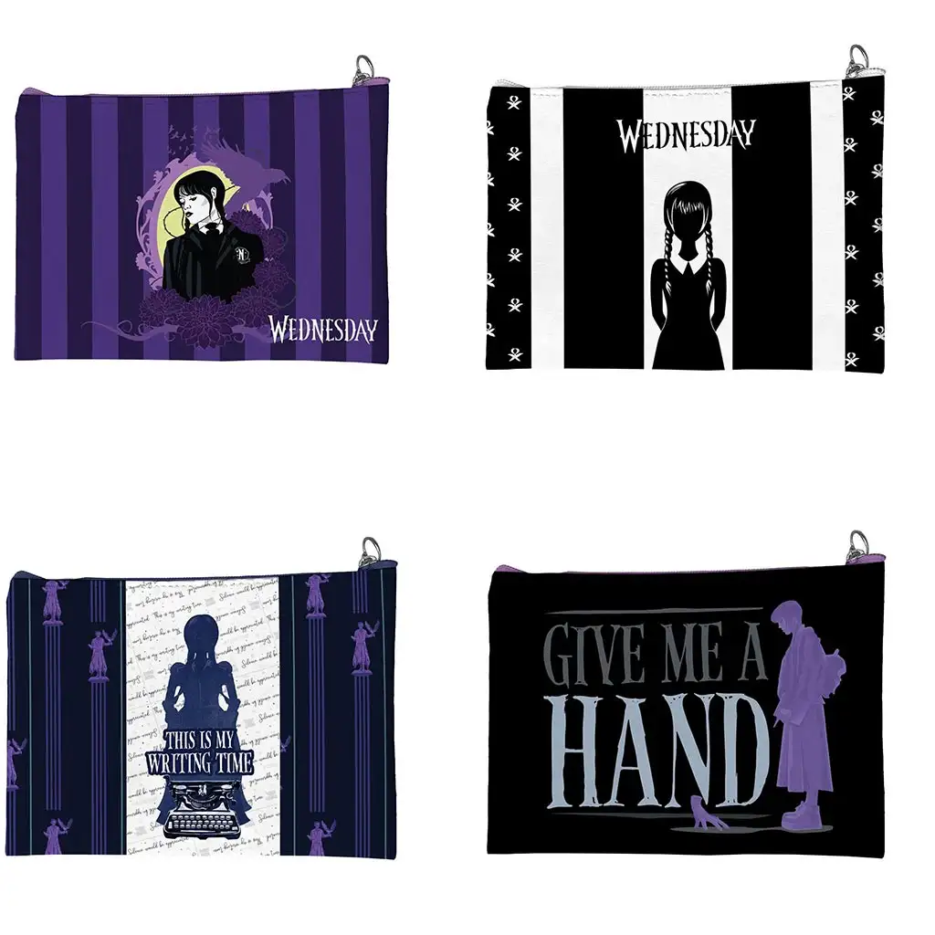 Objavte štýlovú kolekciu kozmetických tašiek inšpirovaných seriálom "Wednesday", ktoré sú ideálnou voľbou na každodenné použitie alebo na cestovanie. Tieto kozmetické tašky s jedinečným dizajnom sú nielen praktické, ale aj skutočne módne doplnky. Každý kus sa pýši originálnym dizajnom, medzi ktorými nájdete ikonickú siluetu Wednesday Addams s rôznymi charakteristickými pozadiami, ako sú fialové kvetinové vzory, klasické čierno-biele pruhy, inšpiratívne spisovateľské motívy alebo tajomný nápis "Give Me A Hand".