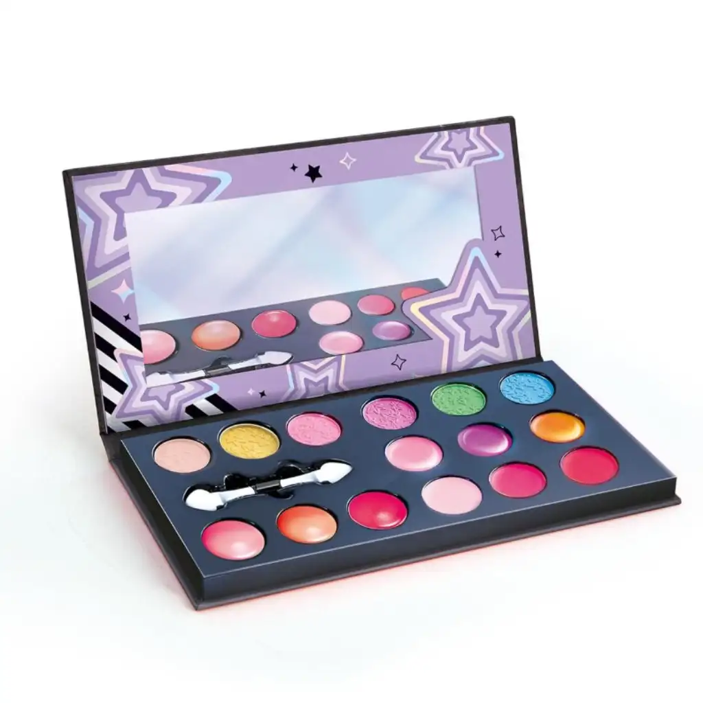 Sada na líčenie Style 4 Ever je dokonalým prvým krokom do sveta módy a líčenia! S touto sadou si deti ľahko osvoja základy líčenia, pretože väčšia a stabilnejšia tácka uľahčuje používanie štetca. Sada obsahuje 6 rôznych očných tieňov, 6 leskov na pery a 3 lícenky, takže je možné experimentovať s množstvom kombinácií. Vstavané zrkadlo umožňuje sledovať proces líčenia, aby bol výsledok dokonalý. Dvojitý štetec uľahčuje osvojenie jemných pohybov, takže deti môžu smelo skúšať svoju kreativitu.