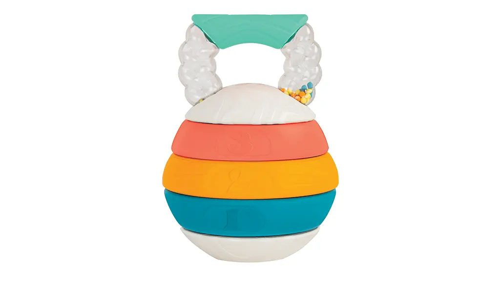 Bebé Fuerte Stack and Count Kettlebell je hračka, ktorá sa dá skladovať samostatne a skladať do seba, a ktorá povzbudzuje deti vo veku 6 mesiacov a staršie k rozvoju svojich zručností. Táto aktivitná hračka má tri krúžky, držadlo s chrastítkom a základňu, ktoré sa všetky dajú poskladať do tvaru kettlebellu. Rodičia musia hračku rozobrať, aby ju mohli vybrať z obalu.