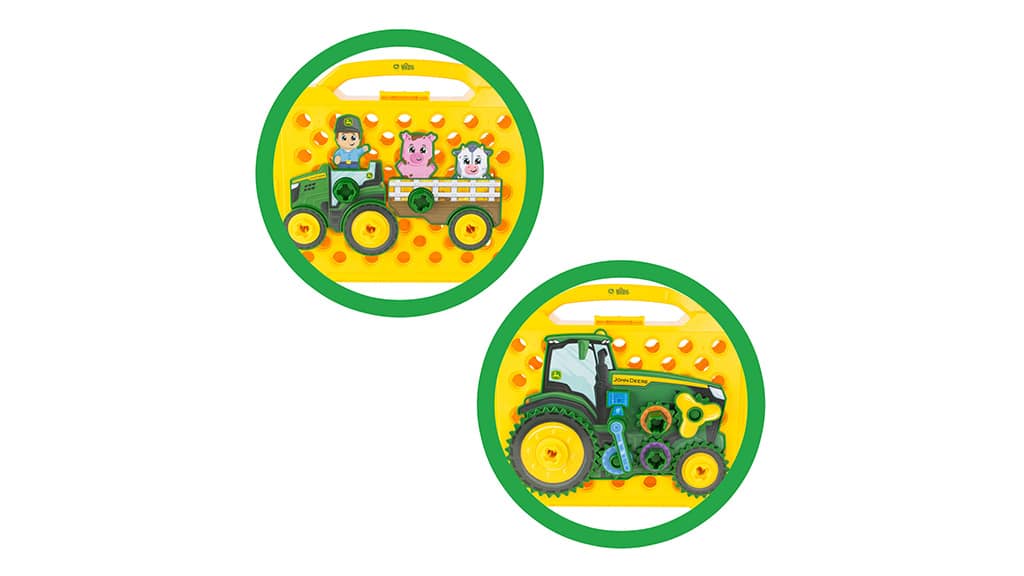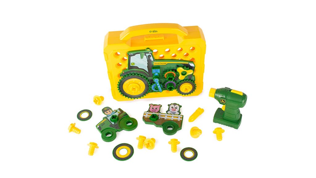 Spoločnosť TOMY prináša zážitok z farmy do detskej izby s hračkou John Deere Build-A-Buddy Activity Board! Táto súprava umožňuje deťom od 18 mesiacov a starším postaviť dve rôzne farmárske scény s traktorom pomocou farebných skrutiek, matíc, kolies a dielov traktora. S detskou vŕtačkou môžu malí pohybovať figúrkami na traktoroch, vrátane farmára, kravy a prasiatka hore a dole. Herná doska leží naplocho a má dve strany, takže sa s ňou dá hrať rôznymi spôsobmi. Deti môžu ozdobiť kolesá a diely traktora priloženými nálepkami, potom si postaviť a vyskúšať vlastnú farmu. Táto hračka nielen rozvíja kreativitu a jemnú motoriku, ale poskytuje aj hodiny zábavy pre najmenších!
