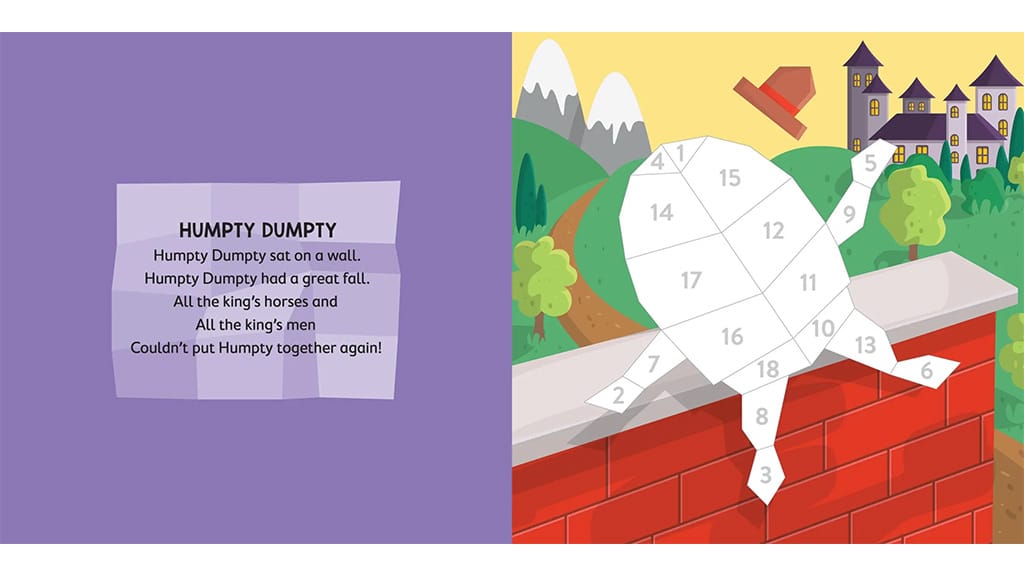 Táto omaľovánka so samolepkami obsahuje klasické detské pesničky, ako napríklad Humpty Dumpty, Jack and Jill, Hickory Dickory Dock a mnoho ďalších známych riekankiek. V knihe sa nachádza 10 veľkých obrázkov, ktoré môžu aj menšie detské rúčky jednoducho ozdobiť samolepkami. Na zadnej strane každej strany je obľúbená detská báseň, takže deti môžu nielen tvoriť, ale zároveň si riekanky čítať alebo počúvať. Táto kniha je ideálnou voľbou pre predškolský vek, pretože rozvíja jemnú motoriku, kreativitu a slovnú zásobu.