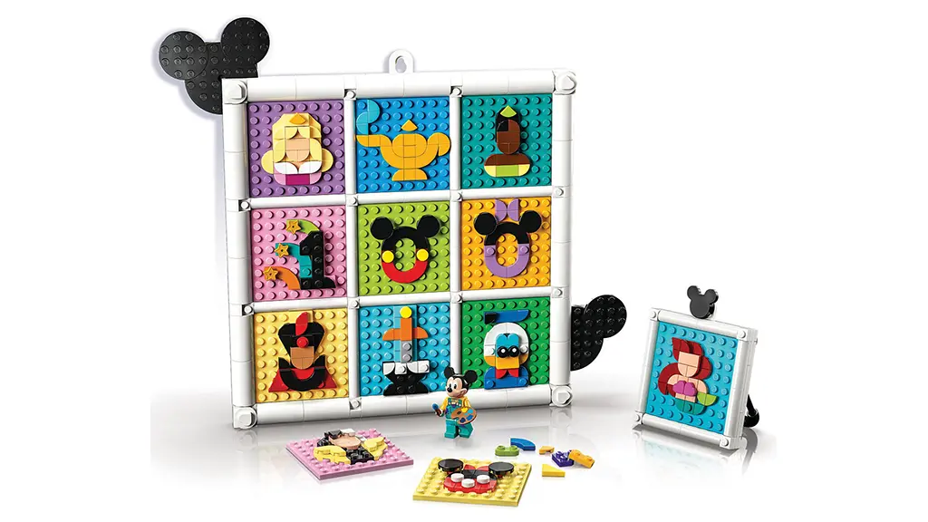 Deti si môžu vybrať z 72 postáv od Disneyho, aby vytvorili koláž, ktorú môžu vystaviť a s novými postavami znova postaviť. Sada s 1,022 dielikmi prichádza s exkluzívnou minifigúrkou Mickey Mouse.