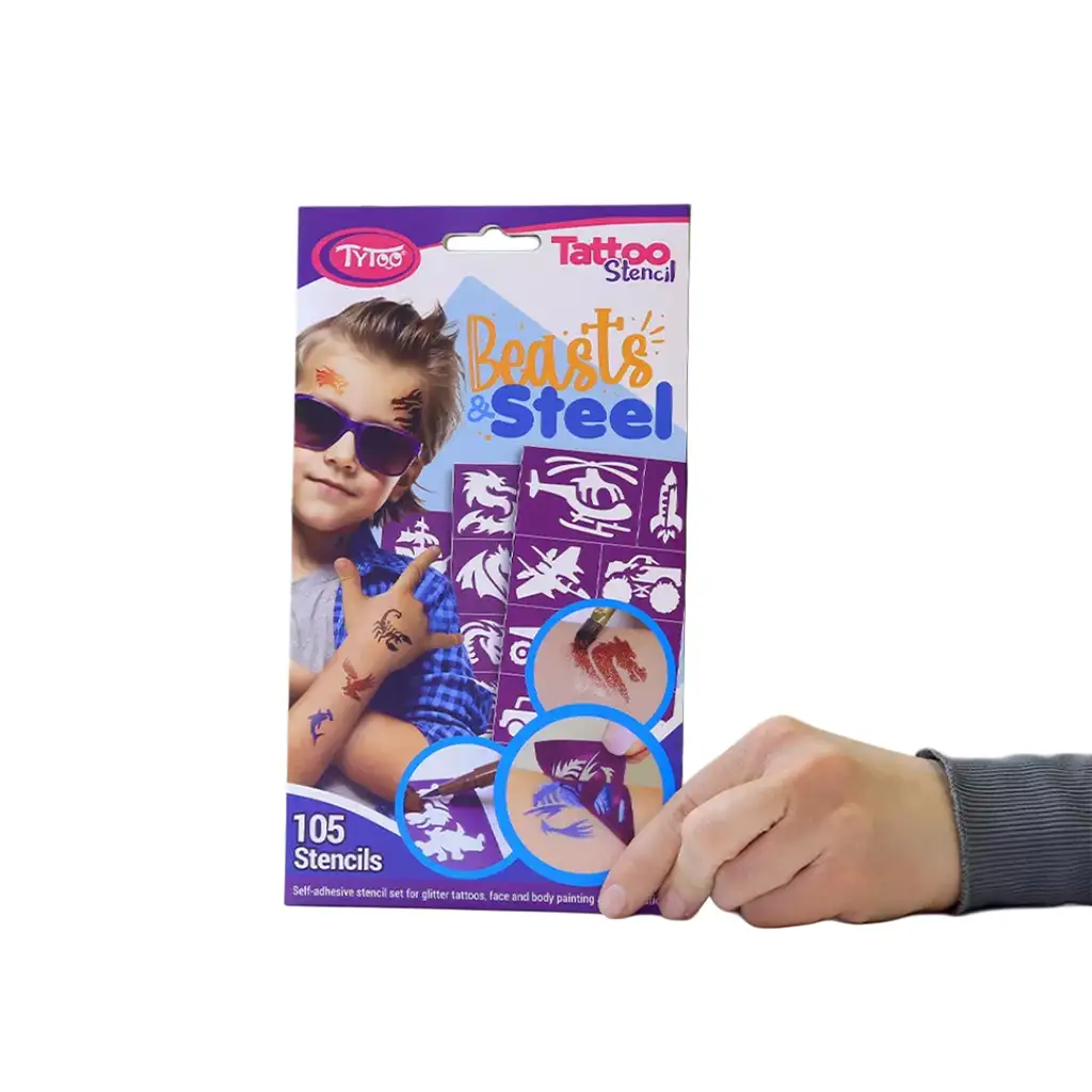Sada šablón na trblietavé tetovanie TyToo Beasts & Steel je skutočným snom pre každého chlapca (alebo odvážne dievča), ktoré je fanúšikom drakov, dinosaurov, áut, strojov alebo desivých predátorov. Táto sada obsahuje 105 rôznych vzorov, medzi ktorými si každé dieťa určite nájde ten svoj štýl – či už je to pretekárske auto, lietajúci vrtuľník, ohnivý drak alebo bojovný lev.
