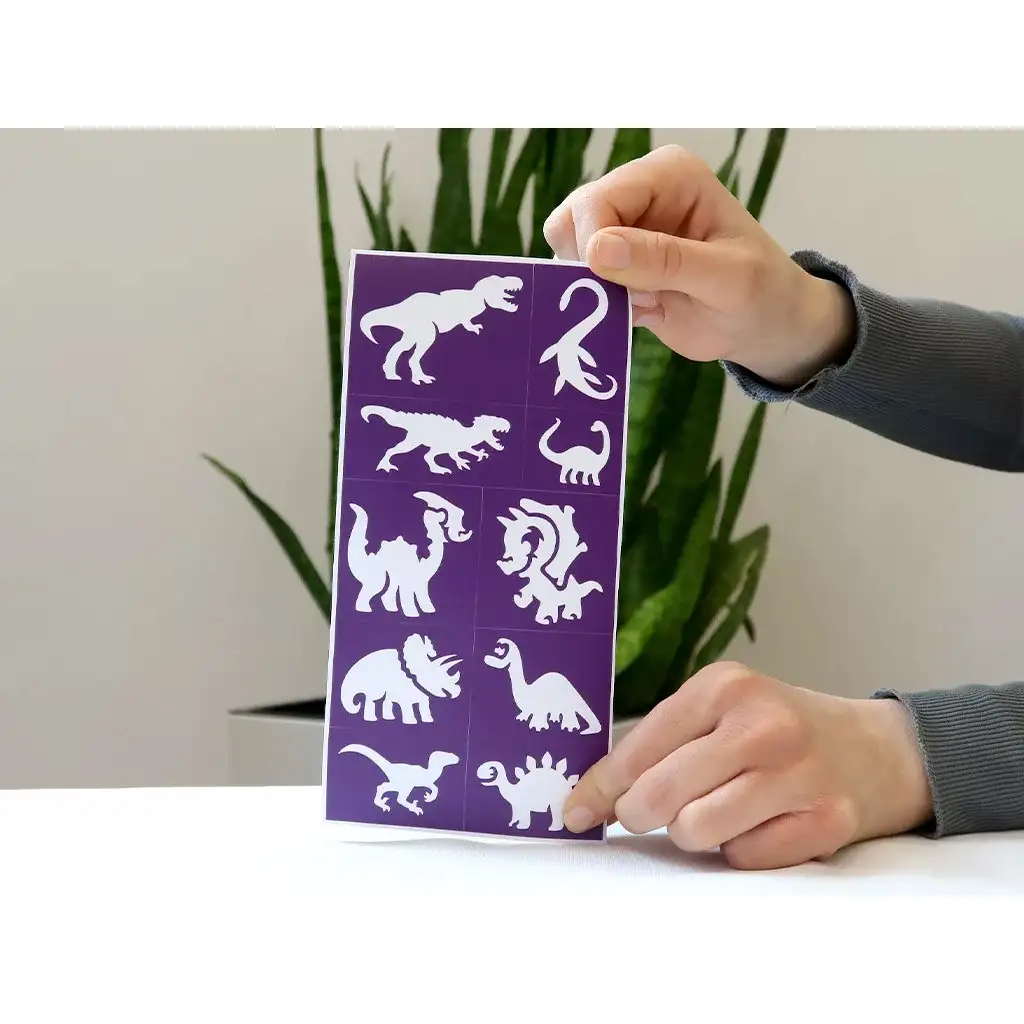 Šablóny môžete použiť viackrát, takže sú nielen kreatívnym, ale aj praktickým a úsporným riešením, navyše rozvíjajú detskú zručnosť a fantáziu. Trblietavé tetovanie vydrží na pokožke aj niekoľko dní, takže malí milovníci dinosaurov môžu s hrdosťou nosiť svoje vlastné umelecké dielka na ruke, nohe alebo tvári.