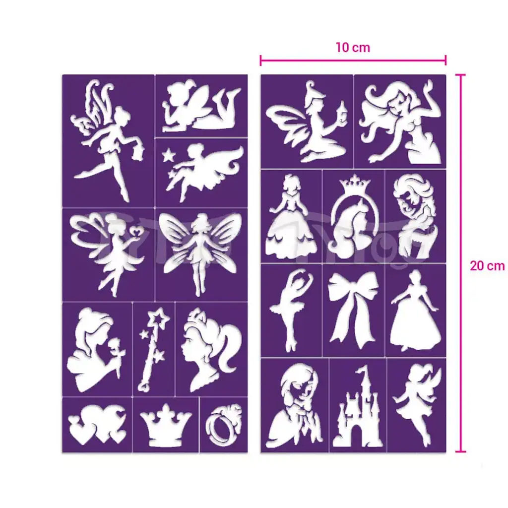 Vzorov je veľa a sú detailné – od klasických siluet víl, cez šablóny koruniek až po siluety bálových šiat. Šablóny sú opakovane použiteľné, takže poskytujú nielen kreatívnu, ale aj ekonomickú zábavu. Ich používanie rozvíja jemnú motoriku a inšpiruje detskú predstavivosť, pričom vám umožní kvalitne a spoločne strávený čas.