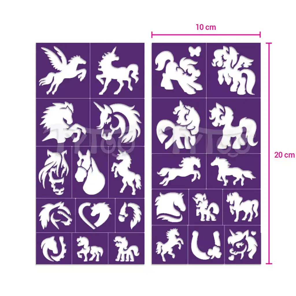 Ak má vaše malé dieťa rado kone, poníky alebo čarovné jednorožce, tento set šablón bude pre vás tou správnou voľbou! Sada šablón na trblietavé tetovanie Magické Kone obsahuje 25 rôznych vzorov koní, poníkov, jednorožcov a pegazov, s ktorými ľahko vytvoríte očarujúce a pútavé trblietavé tetovania. Tento kreatívny set je výbornou voľbou na hranie doma, na narodeninové oslavy, letné tábory alebo akúkoľvek detskú akciu.