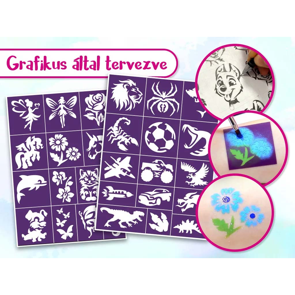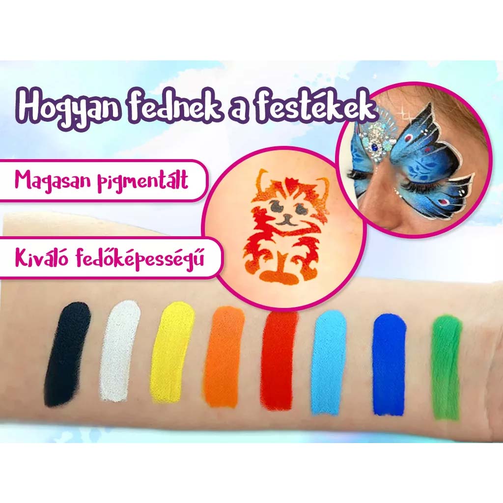 Žiarivé farby na tvár, trblietavé prášky a pomôcky v sade pomáhajú dosiahnuť efektný a trvácny výsledok. Používanie je jednoduché, farby sa ľahko nanášajú a odstraňujú, takže sa nemusíte obávať čistenia. Výborný spoločný program, pri ktorom môžete tvoriť spolu, zatiaľ čo fantázia vášho dieťaťa rozkvitá.