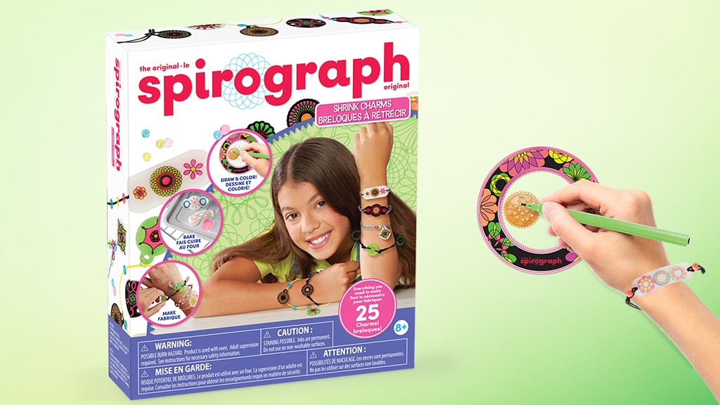 Originálny Spirograph Zmenšujúce sa kúzla kombinuje zábavu Spirographu s možnosťou vytvárať jedinečné šperky. Deti môžu použiť predpripravené vzory alebo vytvoriť vlastné umenie na priložených plastových listoch, ktoré sa rýchlo zmenšia v rúre. Rodiny môžu nasledovať vzory alebo použiť svoju predstavivosť na vytvorenie náramkov, náhrdelníkov a ďalších vecí pomocou priložených šnúr, korálok a spon.
