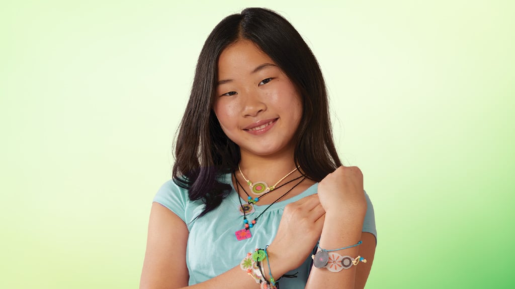 Táto súprava kombinuje zábavu Spirographu s možnosťou vytvárania jedinečných šperkov. Použite predpripravené vzory alebo vytvorte jedinečné umenie na priložených plastových doskách, ktoré sa rýchlo zmenšia v rúre. Môžete s ňou vyrobiť "25 kusov šperkov".