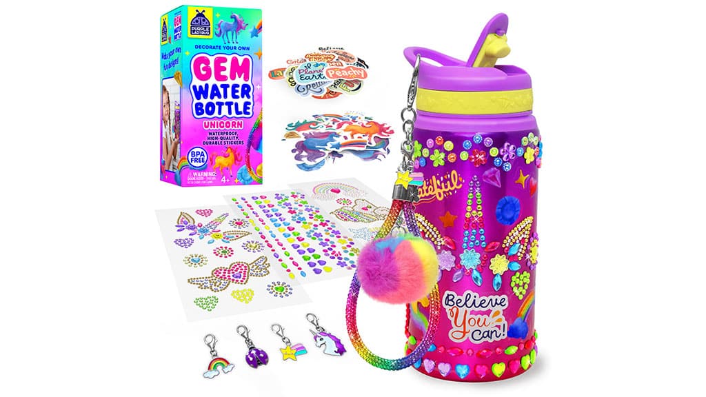 Premeň obyčajnú fľašu na vodu na skutočnú výnimočnosť s trblietavými, jednorožcovými drahokamami, farebnými nálepkami a doplnkami! Každá sada obsahuje 1 hliníkovú fľašu na vodu (objem: 591 ml), 4 jednorožcové prívesky, 1 prívesok s brmbolcom, 3 listy nálepiek s drahokamami, 2 vinylové listy nálepiek a trblietavý remienok na zápästie pre jednoduché prenášanie. Táto sada je prepracovanou, ešte kreatívnejšou a viac prispôsobiteľnou verziou obľúbenej drahokamovej fľaše na vodu, ktorá je ideálnou voľbou pre každé tvorivé dieťa. Počas zdobenia sa rozvíja zručnosť, kreativita a sebavyjadrenie, pričom vzniká jedinečná, trblietavá fľaša, ktorá každý deň prináša radosť!