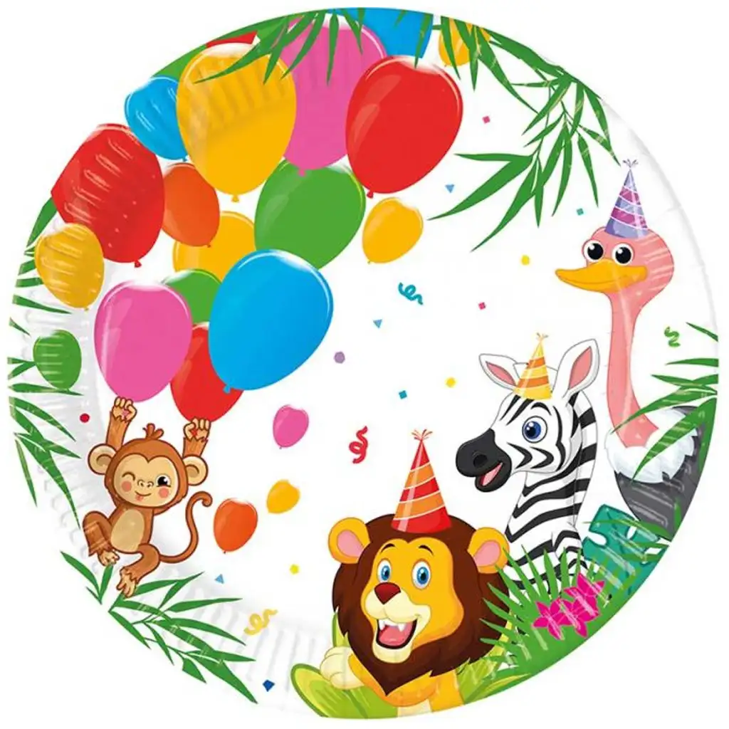 Prines džungľovú atmosféru na detskú oslavu s touto farebnou a zábavnou sadou papierových tanierov s džungľovým motívom! Na tanieroch sú veselé, na párty pripravené zvieratá – opica, lev, zebra a pštros – ktoré vítajú deti, zatiaľ čo farebné balóny lietajú vo vzduchu. Pohľad na balóny, konfety a zvieratá s párty čiapkami zaručene vyčarí úsmev na tvári každého malého hosťa a dokonale sa hodí k prírodnej, hravej atmosfére detskej oslavy.