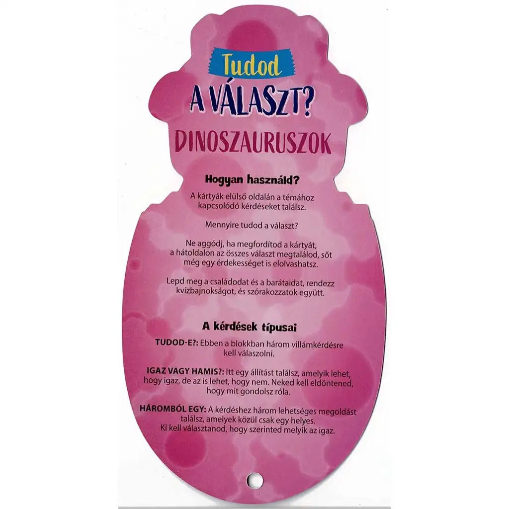 Jedinečný tvar karty, kde sa dinosaurus liahne z vajíčka, robí hru ešte zábavnejšou. Môžete ju hrať sami, so súrodencom alebo počas rodinného kvízového večera – rozvíja vedomosti a podnecuje deti k skúmaniu. Ideálne od 7 rokov, ale zvedavé mladšie deti si hru užijú aj spolu s rodičmi.