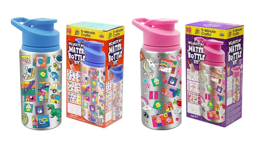 Kolekcia obsahuje dve remeselné aktivity spojené s fľašou na vodu, takže vaše dieťa si môže samo ozdobiť svoju fľašu na vodu a cítiť sa po každom dúšku sebaistejšie. V modrej sade "Ozdob si fľašu" nájdete striebornú fľašu na vodu o objeme 16,9 unce s modrým vrchnákom, nálepky s dinosaury, vodotesné nálepky s vesmírnymi loďami, farebné nálepky a ďalšie zábavné nálepky. Podobne, ružová sada "Ozdob si fľašu" obsahuje rovnakú fľašu na vodu s ružovým vrchnákom, nálepky s drahými kameňmi, vodotesné nálepky s jednorožcami a ďalšie zábavné nálepky. Obe sady obsahujú karabínu, farebné nálepky a štyri permanentné značky.