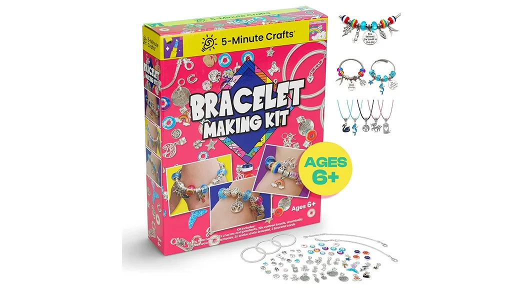 Inšpirovaný 5-minútovými remeselnými videami, tento súprava na výrobu náramkov obsahuje všetky potrebné nástroje na vytvorenie roztomilého a farebného náramku! Balenie obsahuje korálky, náramky na reťaz, náramkové šnúrky, návod na použitie a úložnú krabicu. Táto sada je súčasťou väčšej zbierky 5-minútových remeselných aktivít.