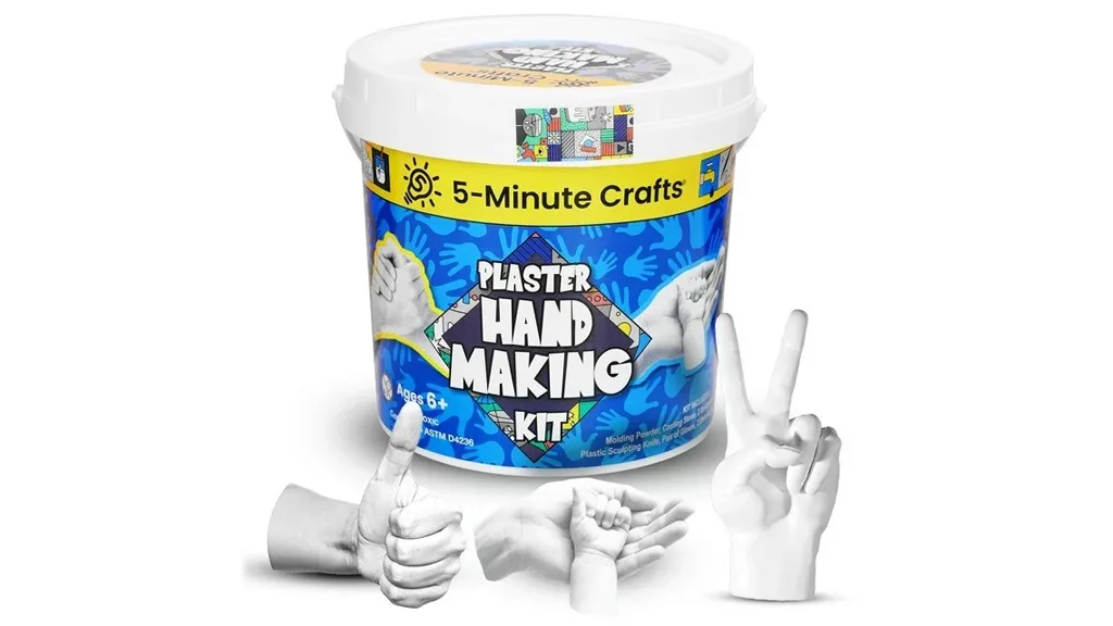 5-minútový Sada na výrobu ruky z remeselného sadry môže vyvolať veľký smiech alebo dojemné chvíle. Sada obsahuje všetky potrebné nástroje na vytvorenie pamiatok vytesaných do kameňa, ako napríklad formovací prášok, zmes na liatie, brúsny papier, sochársky nôž, rukavice a mnoho ďalšieho.
