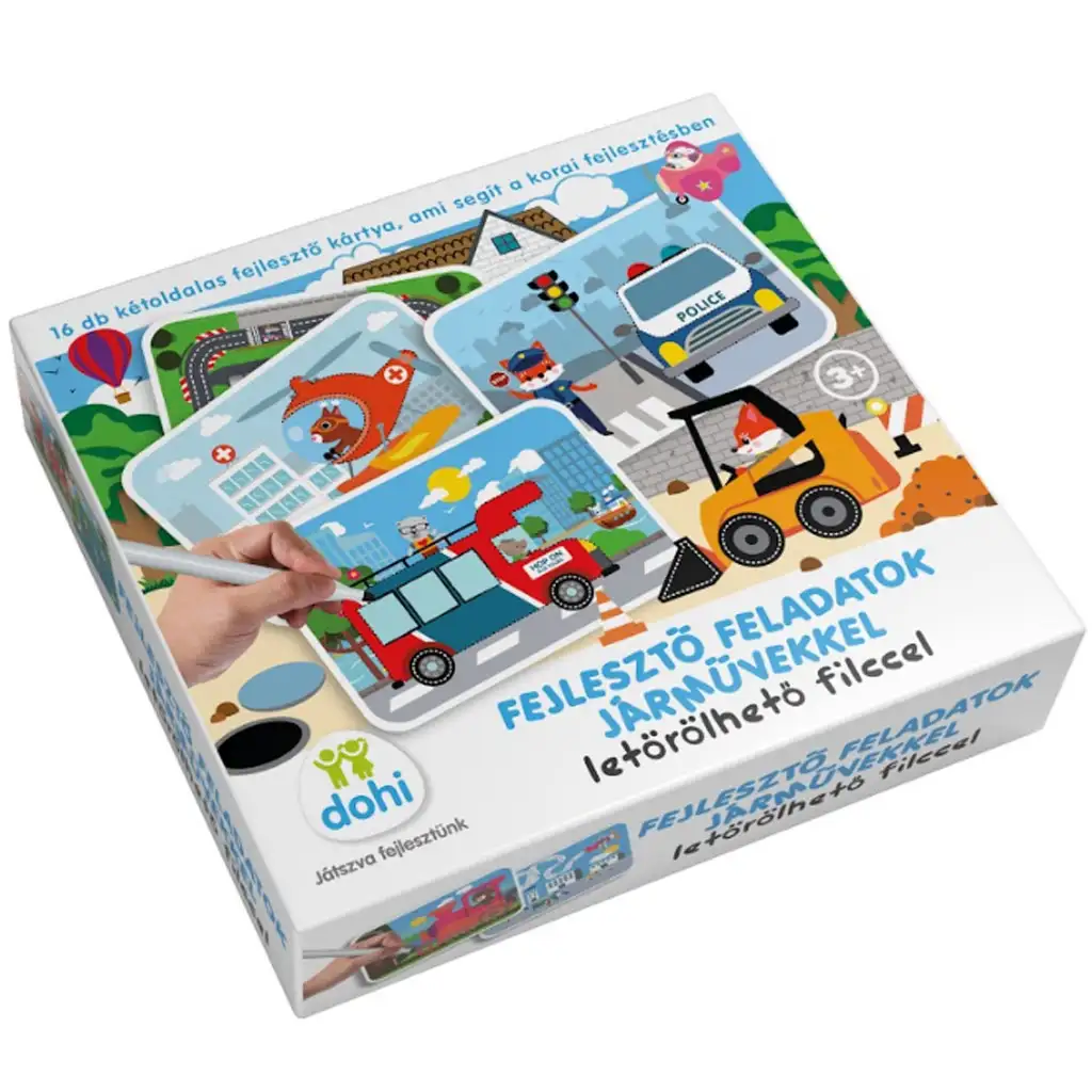 V balení nájdete 16 obojstranných vývojových kariet, z ktorých každá ponúka vzrušujúce a farebné úlohy pre deti. Karty ponúkajú rôzne úlohy, ako je vedenie čiar, hľadanie ciest, spájanie bodov a hľadanie rozdielov. S priloženou mazateľnou fixkou môžu deti hry opakovane začínať, čím sada poskytuje dlhodobý zážitok. Téma vozidiel, či už ide o sanitku, lietadlo alebo pretekársku dráhu, je zaručene vzrušujúca a inšpirujúca pre malých fanúšikov dopravy.