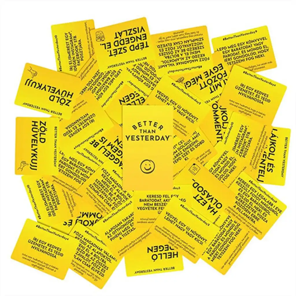 Better Than Yesterday je motivačná hra, ktorá obsahuje 365 úloh na kartách, a ak ich splníš, budeš sebavedomejší, plnší a bezstarostnejší. Môžeš to chápať tak, že každý deň v roku môžeš splniť jednu úlohu. Nájdeš v nej ľahšie výzvy, ale aj také, ktoré môžu byť náročné na splnenie. Počas tejto kartovej hry zistíš, kto si, čo očakávaš od života a tvoje očakávania sa budú deň čo deň zvyšovať. Každý deň splň jednu úlohu a dokonči ich všetky.