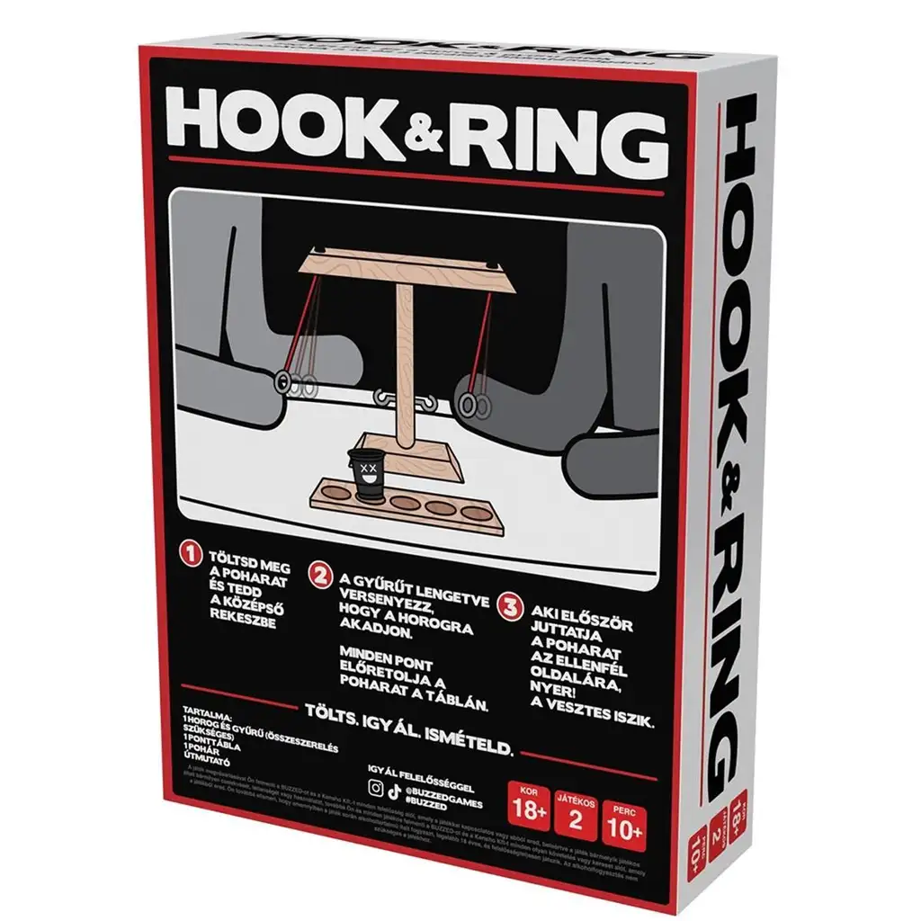 WDYM Hook & Ring spoločenská hra zaručene oživí stretnutia s priateľmi, párty alebo aj nudný večer! Táto jednoduchá, ale neuveriteľne zábavná hra je určená pre dvoch hráčov a v každom kole je dôraz na zručnosť, rýchlosť a reflexy — a samozrejme na dobrú náladu! Cieľom je rozhýbať krúžok tak, aby sa zavesil na háčik, a to rýchlejšie ako váš súper. Každý úspešný zásah vás priblíži k víťazstvu a pohárik sa posunie dopredu na hernej doske... až kým niekto neprehrá — a nepije.