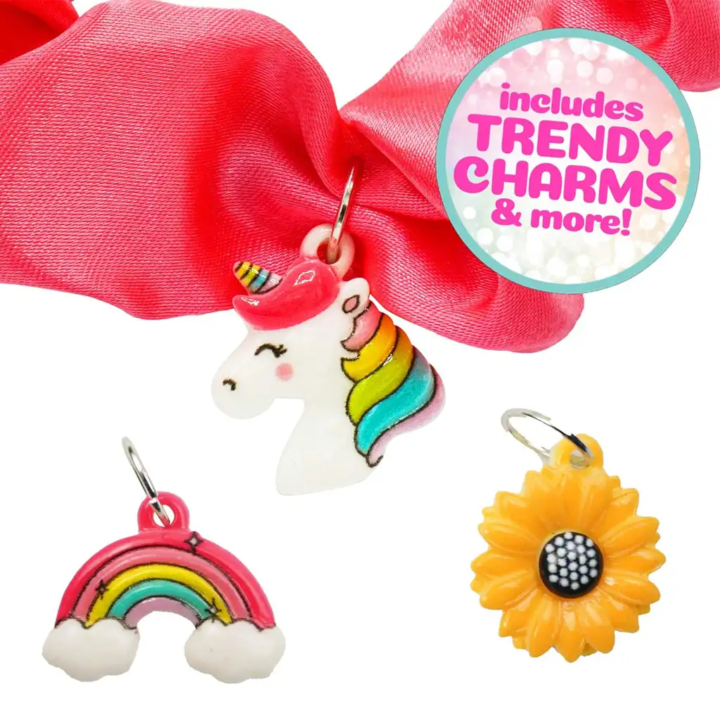 Táto DIY sada je skvelou príležitosťou na rozvoj a uplatnenie kreativity detí, pretože si vďaka nej môžu vytvoriť štýlové doplnky. Sada je špeciálne určená na výrobu gumičiek do vlasov, takže obsahuje veľa saténových pásov spolu s gumenými pásmi, ktoré tvoria základ gumičky.