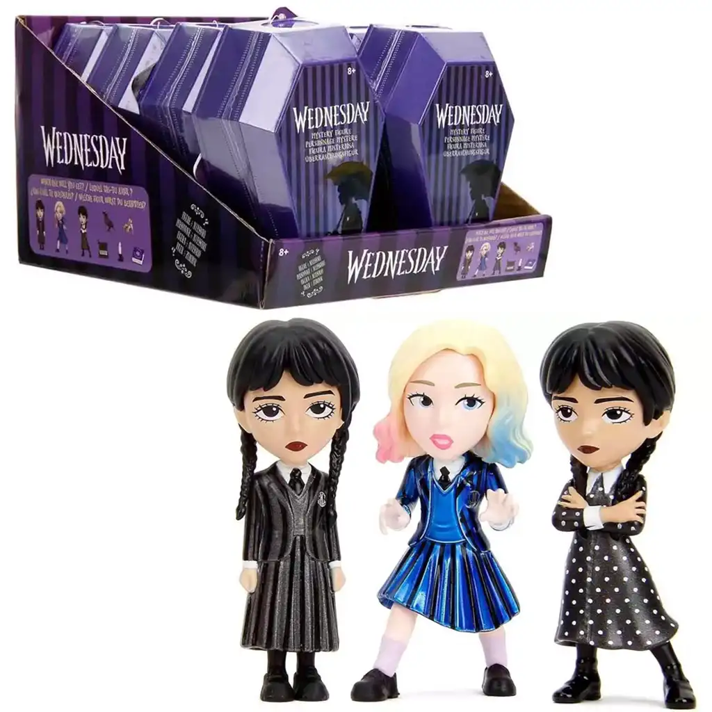 Objavte temne očarujúce tajomstvá sveta Wednesday Addams s touto vzrušujúcou prekvapivou figúrkou! Prekvapivá figúrka Wednesday s doplnkom je naozaj výnimočná hračka, ktorá zaručene očarí malých aj veľkých fanúšikov seriálu. Rakvovitá krabička je už sama o sebe pútavá – deti ju môžu s nadšením otvoriť, aby zistili, ktorá 6,5 cm postavička sa v nej skrýva. Každé balenie obsahuje náhodnú figúrku a príslušný doplnok, s ktorými je možné znovu vytvoriť ikonické momenty zo seriálu alebo vymyslieť vlastné príbehy.