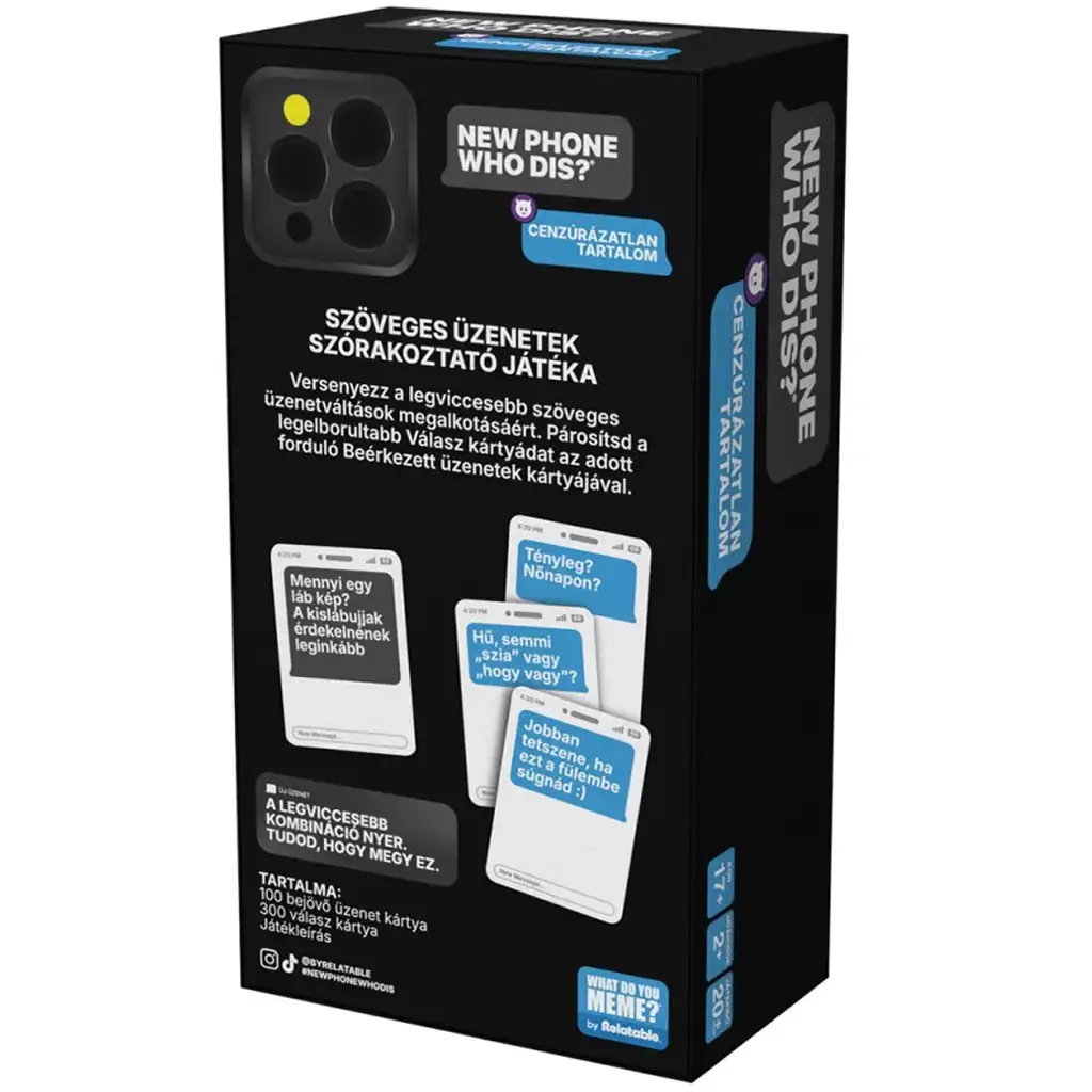 What Do You Meme? – New Phone Who Dis? (Necenzurovaný obsah) je odvážna a úprimná spoločenská hra, určená výhradne pre dospelých. Cieľom hry je, aby hráči k rôznym kartám „prijatá správa“ priraďovali tie najšialenejšie, najvtipnejšie alebo najprekvapivejšie karty „odpoveď“, aby vytvorili najtrápnejší alebo najzábavnejší rozhovor. Vyhráva ten, kto podľa porotcu kola vytvorí najlepšiu kombináciu.