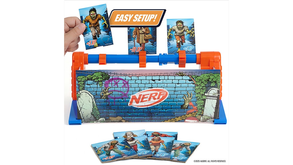 Deti od 8 rokov a staršie umiestnia Zombie karty na rotujúci rám NERF Zombie Strike, potom si môžu vybrať z troch rýchlostí: 15-sekundové pomalé otáčanie, 30-sekundové rýchle otáčanie alebo 20-sekundový režim s meniacou sa rýchlosťou, takže zábava sa nikdy nezastaví.