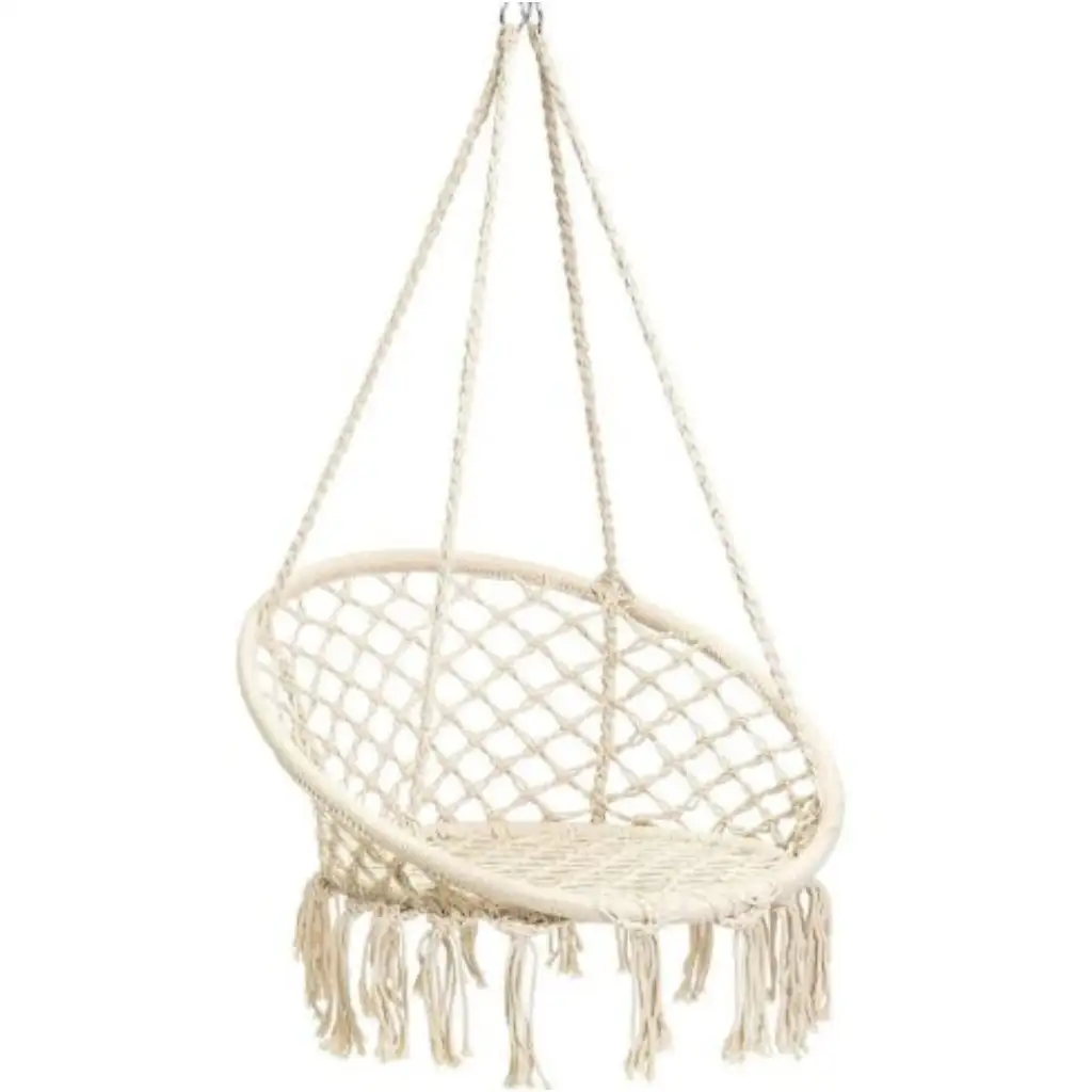 Štýlové a pohodlné závesné relaxačné kreslo Woodyland je ideálnou voľbou na vonkajšie aj vnútorné použitie. Pletený dizajn s prírodným vzhľadom a bohémske strapce zabezpečujú elegantný vzhľad a zároveň ponúkajú pohodlný odpočinok – či už pri popoludňajšom čítaní alebo pri krátkej hojdacej relaxácii.