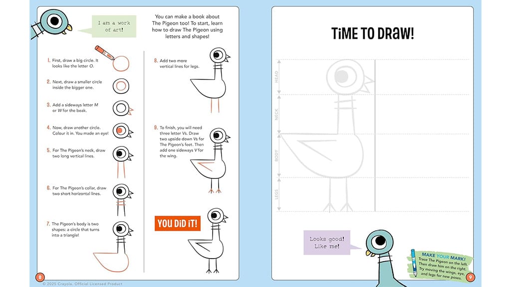 Omaľovánky sú skvelou, bezobrazovkovou možnosťou a vynikajúcimi spoločníkmi na cestovanie, ktoré povzbudzujú deti, aby tvorili a používali svoju predstavivosť. Spoločnosť Hidden Pigeon Company, ktorú spoluzaložil slávny detský autor a ilustrátor Mo Willems, teraz spolupracuje s Crayolou na vytvorení 80-stranovej omaľovánky a pracovného zošita. Táto kniha predstavuje Willemsove populárne postavy, Holuba, ako aj Slona a Prasiatko. Omaľovánka nie je len zábavná, ale rozvíja aj jemnú motoriku, kreativitu a schopnosť riešiť problémy, zatiaľ čo deti sa môžu ponoriť do sveta svojich obľúbených postáv. Je ideálnou voľbou na dlhšie cesty, domáci oddych alebo aj ako darček.Deti môžu použiť obojstranné fixky na vyfarbovanie komiksových stránok zobrazujúcich holuba. Tieto omaľovánky nie sú len zábavné, ale rozvíjajú aj kreativitu a jemnú motoriku. Obojstranné fixky umožňujú kresliť čiary rôznej hrúbky, čím robia kresby ešte pestrejšími. Stránky vytvorené spoločnosťou Hidden Pigeon Company poskytujú vzrušujúcu a veselú zábavu pre všetky vekové kategórie.