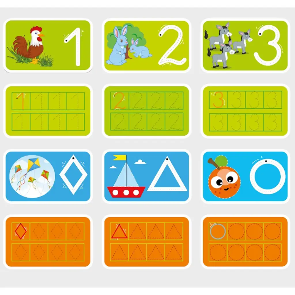 Hra pomáha pri osvojovaní správneho písania čísel a rozpoznávaní základných geometrických tvarov. Farebné, veselé ilustrácie, ako sú zajačiky, lode alebo draci, hravo upútajú pozornosť detí, zatiaľ čo učenie sa stáva príjemným zážitkom. Karty sú vyrobené z odolného materiálu a ich kompaktná veľkosť umožňuje, aby ste ich mohli vziať so sebou aj na cesty.