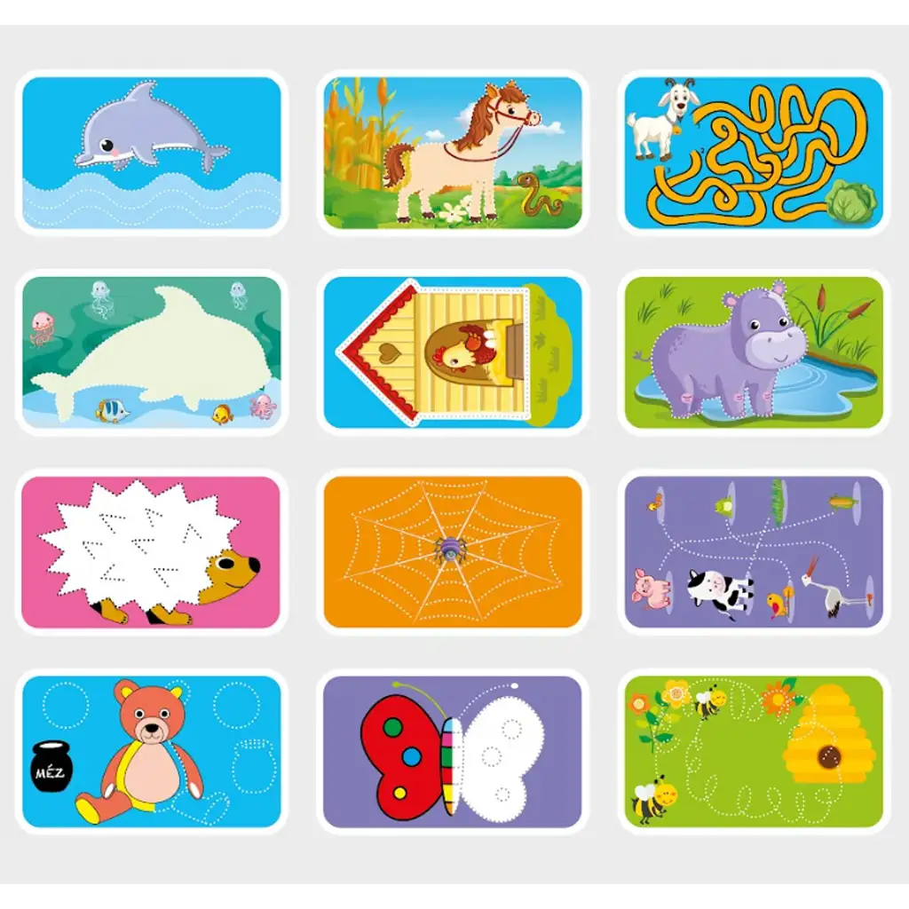 Balíček obsahuje 12 obojstranných kariet, na ktorých každá ponúka iné zvieracie úlohy pre deti. Medzi úlohami nájdete cvičenia na vedenie čiar, bludiská, spájanie bodov a dopĺňanie vzorov. Karty sú stierateľné, takže s priloženým fixom je možné úlohy riešiť znova a znova, čo zaručuje neustálu možnosť cvičenia a učenia.