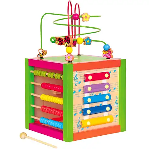 Vynikajúca zábavná hračka pre najmenšie detičky, ktorá nielen dobre pobaví ale slúži pre vývoj jemnej motoriky dieťaťa. Drevená didaktická kocka ponúka veľké množstvo vývojových činností, na hornej časti sa nachádza labyrint, ktorý slúži na posúvanie korálikov rôznych atraktívnych tvarov, na boku sú hodinky, hudobný nástroj, počítadlo a taktiež motorický posúvný labyrint.