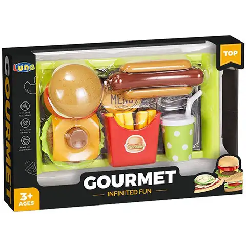 Skoro každé dieťa miluje hamburgery, hranolky a nápoje z Fast Food reštaurácií, takže táto sada určite dosiahne veľký úspech. Balenie obsahuje hamburger, hotdog, porciu hranoliek, pohár nápoja a tácku, pomocou ktorých môžu vyčariť z detskej izby skutočne super Fast Food reštauráciu. Pomocou súpravy si deti môžu precvičovať objednávanie jedla typického pre fastfoody, jeho výdaj a proces platby, čím si zdokonalia sociálne zručnosti detí.
