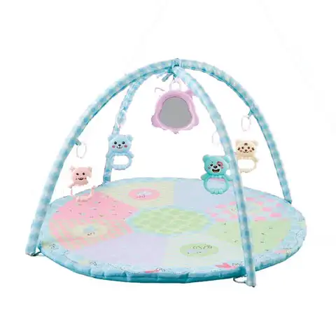 Môžete prekvapiť svoje deti s výnimočný hracím kobercom, ktorý sa môže dlhodobo používať a určite sa bude páčiť deťom. V balení je modrý koberec s dvoma krivými výstuhami, na ktorom sú zavesené hračky a zrkadlo, ktoré poskytujú skvelú zábavu a zároveň zlepšujú videnie a pohyb. Ak dieťa leží na bruchu na koberci, môže vidieť rôzne vzory, ktoré tiež prispievajú k rozvoju videnia.